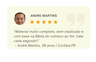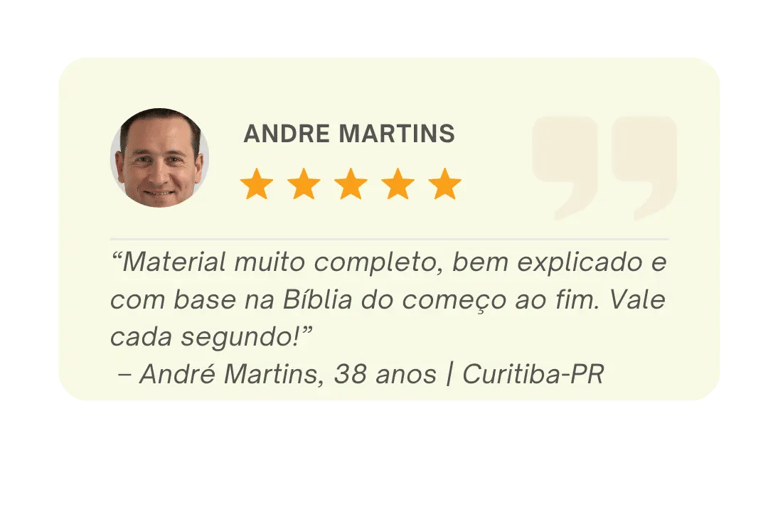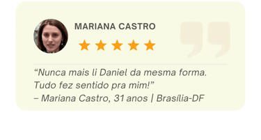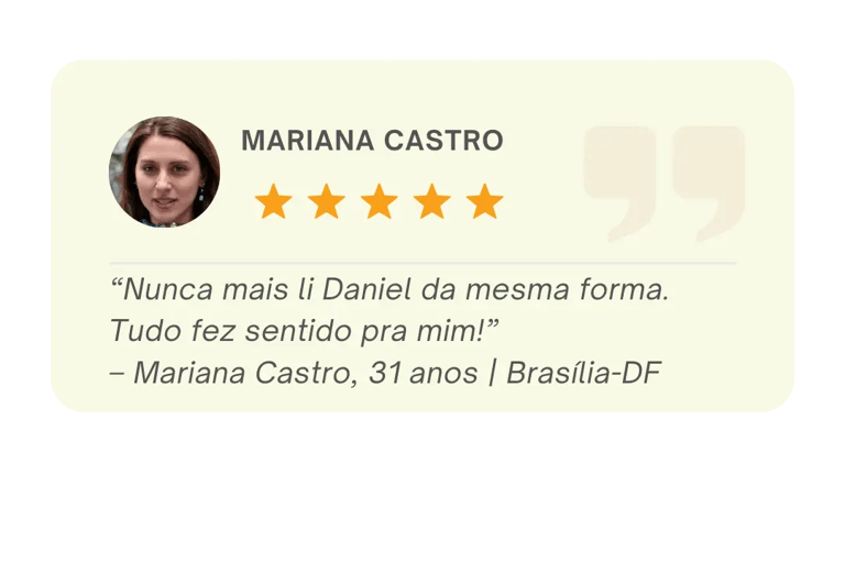 Explicações detalhadas e fáceis de entender. Cada ensinamento do livro de Daniel é explicado de forma clara, com conexões lógicas e exatas, que vão te conduzir em uma jornada de entendimento profundo. Este é o guia mais completo que já produzimos, totalmente focado em desvendar a mensagem profética de forma prática e transformadora.