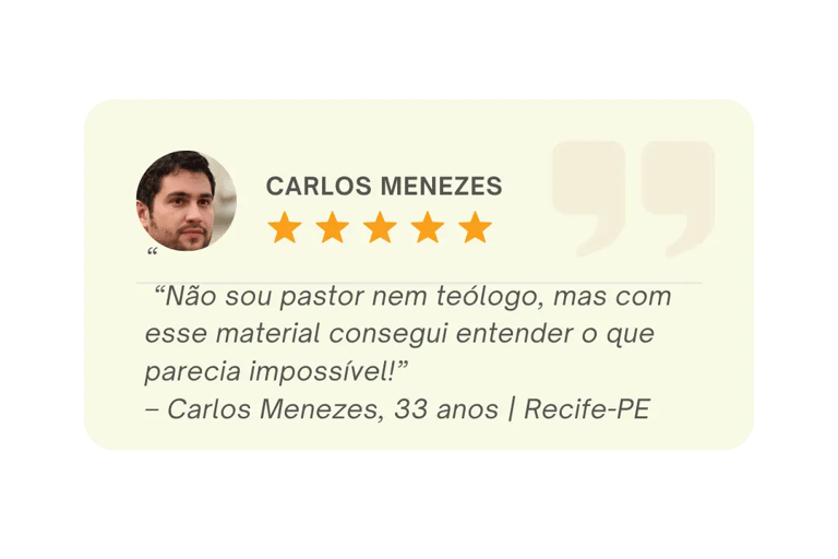 Porque sem Daniel, o Apocalipse não faz sentido. Sem entender as 70 semanas, você fica perdido nas profecias. Daniel é o mapa que conecta tudo - do passado ao futuro eterno. É o conhecimento que transforma cristãos confusos em cristãos confiantes.